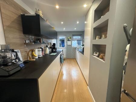 KITCHEN/DINER - 9.19m x 2.37m (30'1" x 7'9") Fitted with a range of modern units and work surfaces with feature wood effect upstands and inset sink unit. Built in electric oven with ceramic hob over, space for dishwasher, washing machine and space for fridge/freezer. Feature display shelving, cupboard housing Glow Worm gas boiler, wood effect flooring, double glazed windows to the side and rear and door leading out to courtyard patio.