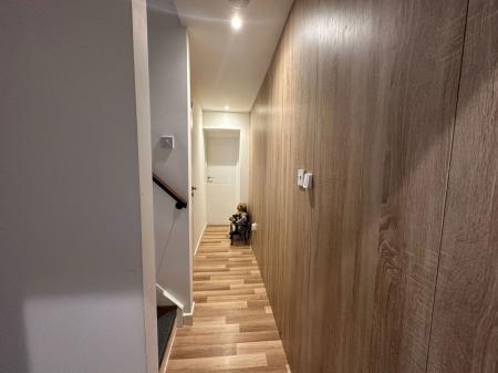 LOUNGE - 3.3m x 2.46m (10'9" x 8'0") Double glazed front door, large double glazed window to front, wood effect flooring, cupboard housing electric meter and consumer unit and further alcove cupboards.