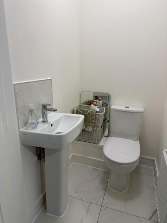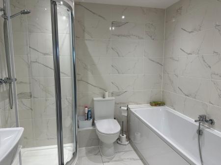 BATHROOM A modern white luxury family bathroom well appointed with a full suite including bath, shower cubicle, WC and wash hand basin with LED back lit mirror over. Porcelain floor tiling.