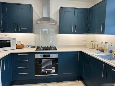 KITCHEN - 3m x 1.8m (9'10" x 5'10") A modern range of kitchen units beautifully finished with stylish counter tops. There is a range of integrated appliances including a built in oven and hob, dishwasher and fridge/freezer. Ceiling mounted spotlights.