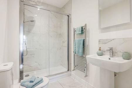 ENSUITE SHOWER ROOM Beautifully fitted with a matching suite to the family bathroom having a double shower cubicle with glass doors and mains shower with over sized head. Wash hand basin with led back lit mirror over plus close coupled wc. Tiling to shower and tiled floor.