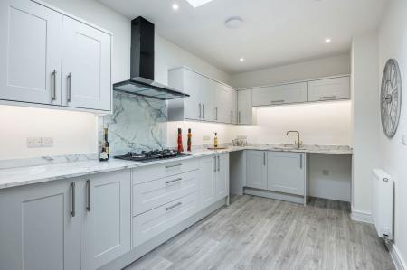 KITCHEN - 5.1m x 2.5m (16'8" x 8'2") A beautifully appointed and spacious kitchen fitted with a comprehensive range of contemporary wall and base units. There is a range of integrated appliances including a built in oven and hob with stainless steel cooker hood and glass splash back, dishwasher and fridge/freezer. Spotlights to ceiling. Plumbing for washing machine.