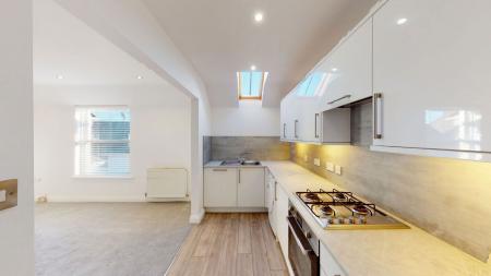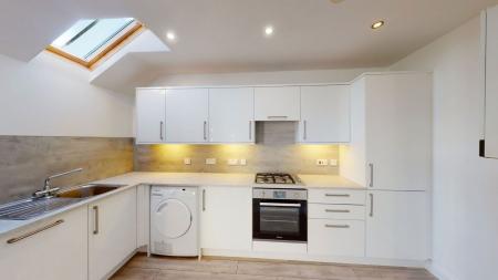 KITCHEN 12' 5" x 5' 8" (3.79m x 1.751m) Fitted with a modern matching range of high gloss fronted wall and base mounted units and drawers with roll edge work surface over and under unit lighting. Single bowl stainless steel sink unit with mixer tap. Fitted electric oven and gas hob with concealed cooker hood above. Fitted washing machine, and fridge/freezer. Double glazed skylight window, central heating boiler and inset ceiling spotlights.