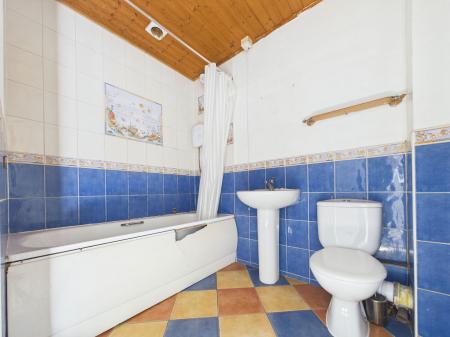 BATHROOM Bat with overhead shower, low level WV, wash basin and door into:-