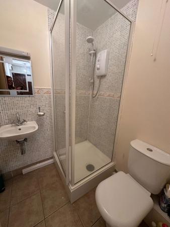 SHOWER ROOM Shower unit, wash basin, low level WC. Radiator.