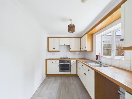 KITCHEN - 3.44m x 2.2m (11'3" x 7'2") A good sized kitchen with built in oven and hob, space for a washing machine. Cupboards and drawers over surfaces, grey vinyl flooring, combi boiler, window out to patio/courtyard area