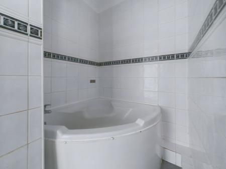BATHROOM Corner bath with shower over low level W/C and basin, fully tiled, wall mounted radiator.