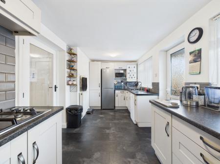 KITCHEN - 4.94m x 2.48m (16'2" x 8'1") A modern fitted kitchen with cupboards and doors over and under surfaces, built in oven/grill/gas hob, space for a washing machine, boiler, 2 uPVC windows facing out to the back garden. Utility area off kitchen.