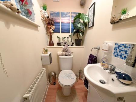 CLOAK ROOM Side aspect uPVC double glazed window with a single panel radiator centred beneath it. There is a close coupled WC and wash hand basin within.