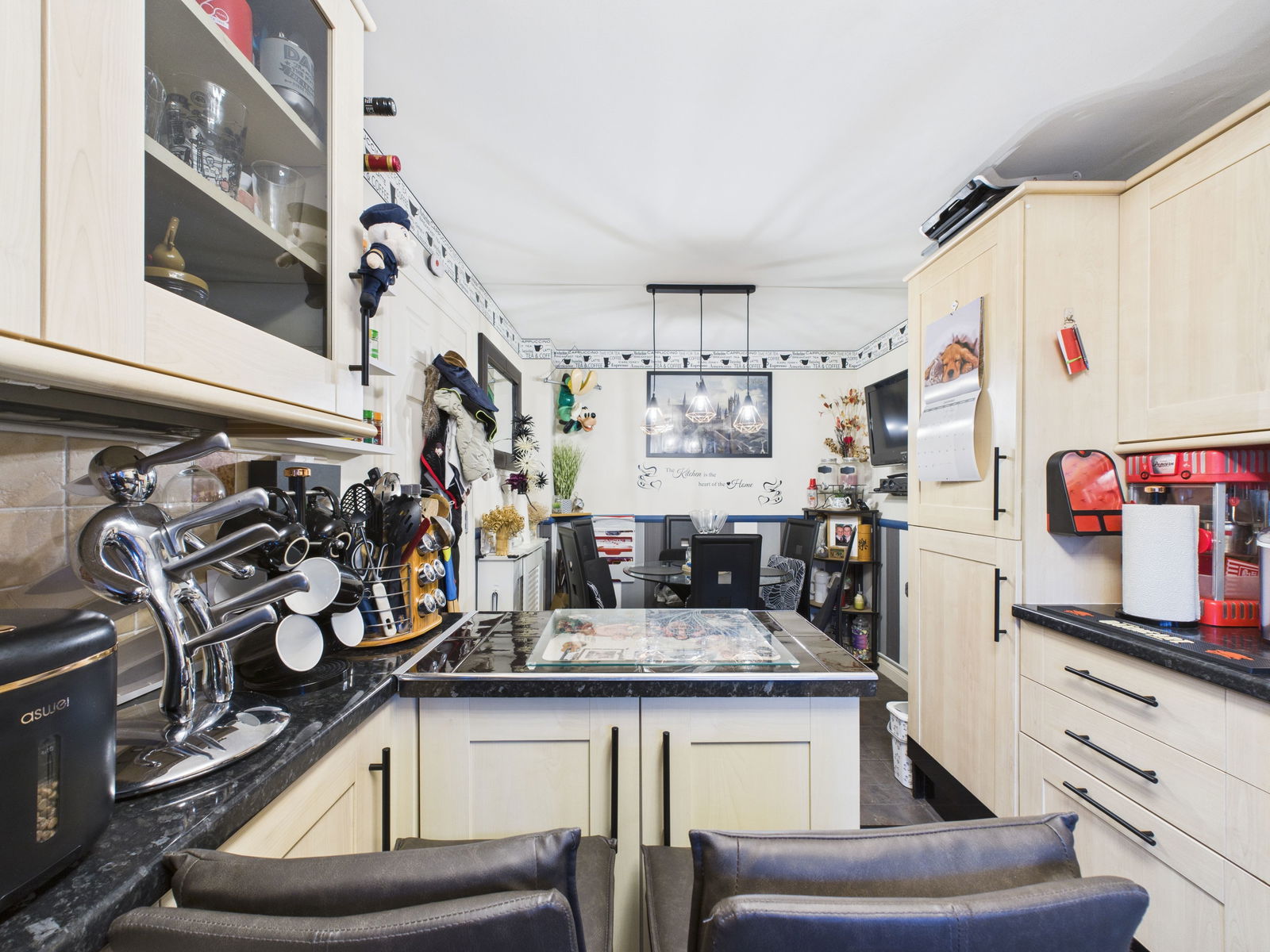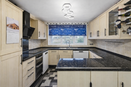 KITCHEN/DINER - 4.88m x 2.53m (16'0" x 8'3") Front aspect uPVC double glazed window that looks out towards a wooded area and is not overlooked itself. There is a comprehensive range of base, display and eye level units in light wood effect. The work surfaces are marble effect, rolled edge with tiled splash backs all round. The sink is a stainless steel one and a half bowl, with a monobloc mixer tap and pull out shower head. This area is nicely centred under the window for good natural light. There is under counter plumbing and space for both a full size dishwasher and an washing machine. The four burner gas hob is inset with a double oven and grill below and an extractor hood over. The fridge freezer is stacked and integrated into the cupboard space. A wrapped around bar area offers further storage and food preparation space. The kitchen opens into a dining area and where there is a single panel radiator and room for a six seater dining suite.
