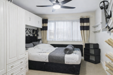 MASTER BEDROOM - 3.84m x 2.6m (12'7" x 8'6") Front aspect uPVC double glazed window offering elevated views and not overlooked with a single panel radiator beneath it. This room features fitted wardrobes with bedside drawers and has a Florida style central ceiling fan. Door to;