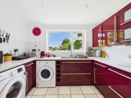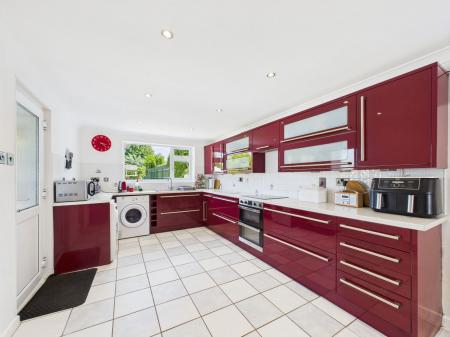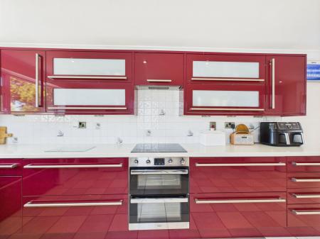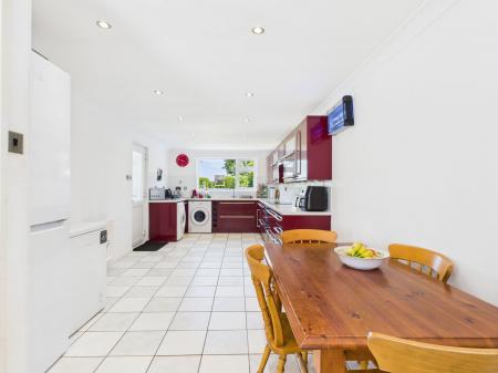 KITCHEN/DINER - 7.34m x 3.11m (24'0" x 10'2") A very large kitchen/diner ideal for entertaining done to a high standard with burgundy luxury fitted kitchen with an extensive range of wall and base units with integrated electric oven, hob and hood. Sink under window facing out to beautiful sunny south facing garden, space for washing machine, dryer and fridge freezer. uPVC window facing the front of the property, uPVC back door leading onto patio and back garden. Radiators. Ceramic tiled floor.