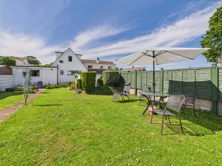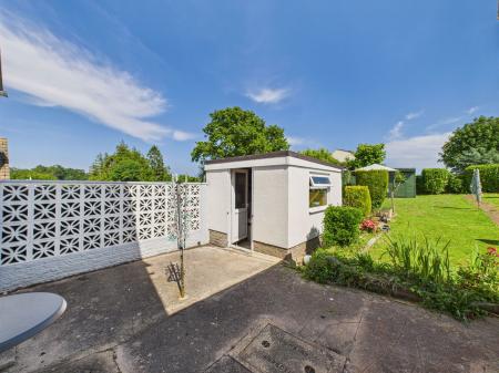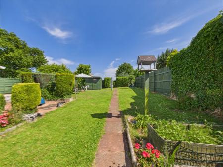 BACK GARDENN A beautifully enclosed sunny garden with level lawns, patios and outside WC. Concrete shed/workshops/storage.