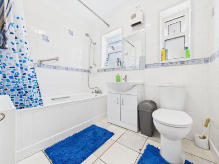 DOWNSTAIRS BATHROOM A modern family bathroom comprising of bath with overhead mains shower, vanity unit with inset wash basin and low level WC.