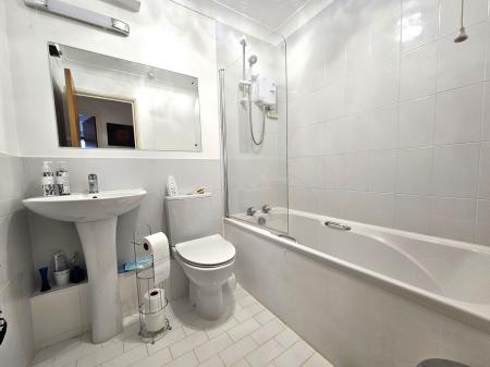 BATHROOM Fitted with a modern matching 3 piece white suite comprising of: Panelled bath with electric shower, low level WC and pedestal wash hand basin with mixer tap, shaver point and light above. Extractor fan, tiled flooring.