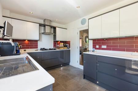 KITCHEN. 3.816 x 2.672 max Fitted with a modern, matching range of and floor mounted units comprising cupboards and drawers. Stylish square edge work surfaces with inset 1 1/2 bowl stainless steel sink unit with mixer tap. Modern tiled splash backs. Fitted double oven and five burner gas hob with cooker hood above. Integral dishwasher and integral fridge. Ceiling down lights along with under counter lights and LED lights fitted into the kick boards. Tiled effect hard flooring. Double glazed window along with double glazed door to rear aspect leading out into rear garden.