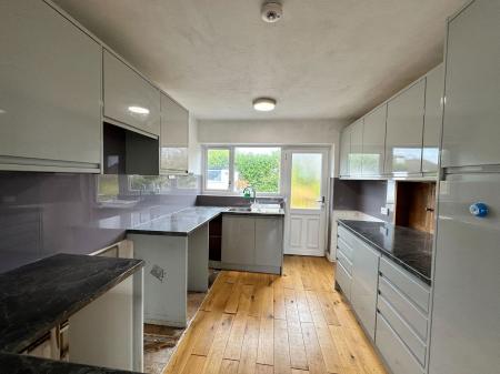 KITCHEN 3.6 m x 2.7 m max Fitted with a range of modern light grey gloss wall and base units with grey marble effect countertops over. Single drainer stainless steel sink unit. Various appliance spaces for washing machine, fridge freezer, etc. Solid wood flooring. Double glazed window and back door to the rear garden.