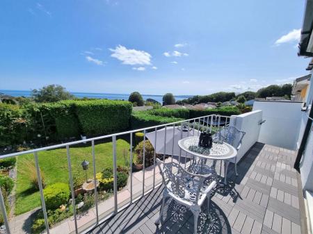 OUTSIDE To the front the property is beautifully landscaped and interspersed with a variety of mature palms and shrubs, a driveway goes down both sides of the property, one driveway leads to the garage, allowing parking for up to seven cars. To the rear is a balcony with composite decking which enjoys superb views across to Berryhead, Broadsands and across Torquay. Steps lead down to the garden which is laid mainly to lawn and there is a goldfish pond with a filter and pump.