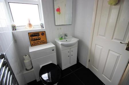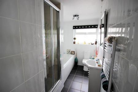 BATHROOM Fitted with a modern matching four piece white suite comprising of panelled bath with mixer tap, shower cubicle with brand new electric shower. Low level W/C and wash hand basin with mixer tap set within vanity unit with cupboard below. Double glazed window to side, chromed ladder style radiator, tiled walls and floor.