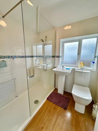 A modern white suite having a walk-in shower with glass screen and mains fed shower unit, wash hand basin and close coupled WC. Double glazed window. Tiled walls. Airing cupboard with radiator.