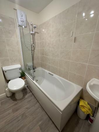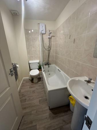 BATHROOM Fitted with a matching three piece white suite comprising a pedestal hand wash basin, WC and a panel fronted bath with electric shower above. Extractor. New grey vinyl flooring. Radiator.