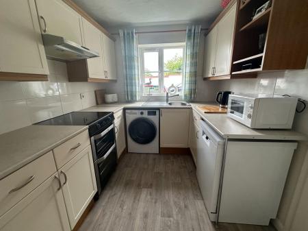 KITCHEN - 2.35m x 3.15m (7'8" x 10'4") Fitted with a matching range of wall and floor mounted units comprising cupboards and drawers. Rolled edged work surfaces with inset one bowl stainless steel sink unit with mixer tap. Tiled splash backs. Space for oven with fitted cooker hood above. Spaces for a washing machine and fridge/freezer, new grey vinyl flooring and dishwasher. Double glazed window to the front aspect and fitted ceiling down lights.