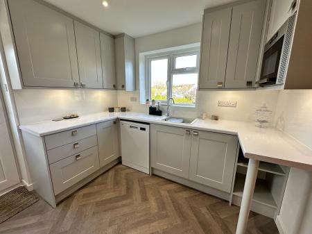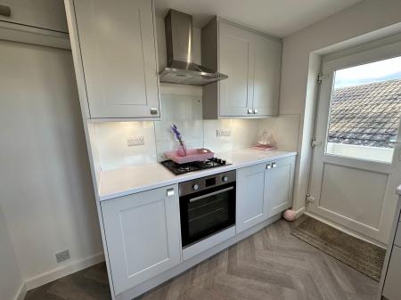 KITCHEN - 3.16m x 2.8m (10'4" x 9'2") Fitted with a range of modern matching wall and base units finished with white counter tops. Built in stainless steel oven and hob with stainless steel cooker hood over. Under cabinet lighting. Integrated microwave oven plus space and plumbing for a dishwasher and additional appliances. Double glazed window to rear with distant country views. Double glazed door to side access and garden.