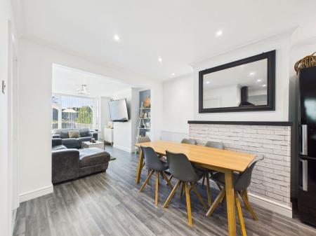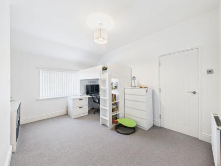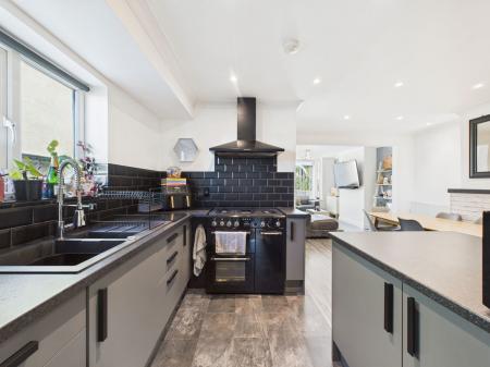A very modern open plan lounge/kitchen/diner. The lounge is a good size with uPVC bay window and radiator. This opens out to the dining area, which has space for 6 seater dining. The kitchen is a very modern Howdens kitchen in matt grey, with cupboards and drawers under and over surfaces, there is a range cooker and space for a fridge/freezer. (See floor plan for dimensions)
