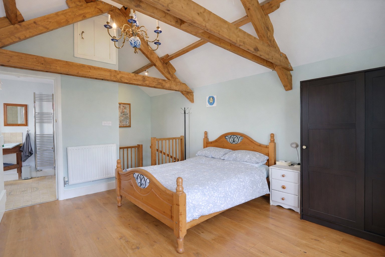 The modern section of the property, accessed via an oak staircase, leads to the principal bedroom which features exposed A frame beams, French doors opening onto a balcony and an ensuite shower room.