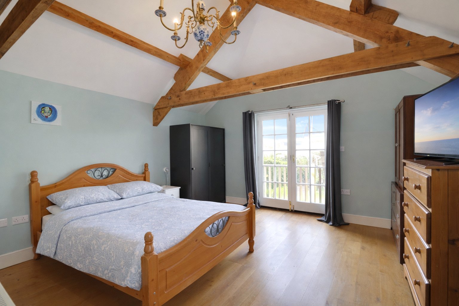 The modern section of the property, accessed via an oak staircase, leads to the principal bedroom which features exposed ‘A’ frame beams, French doors opening onto a balcony and an ensuite shower room.