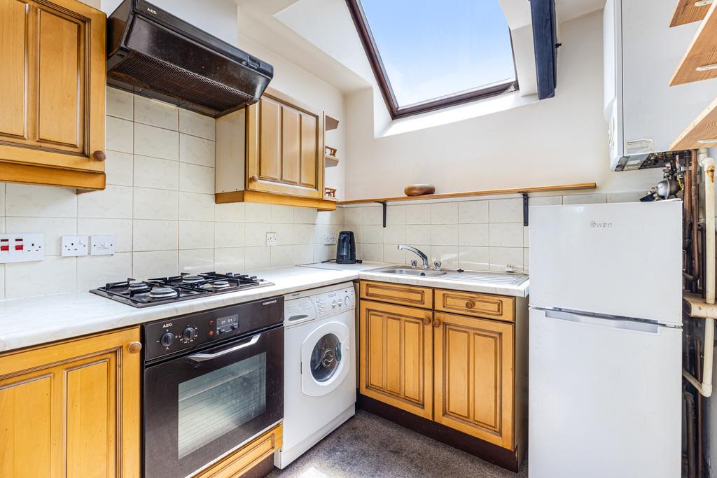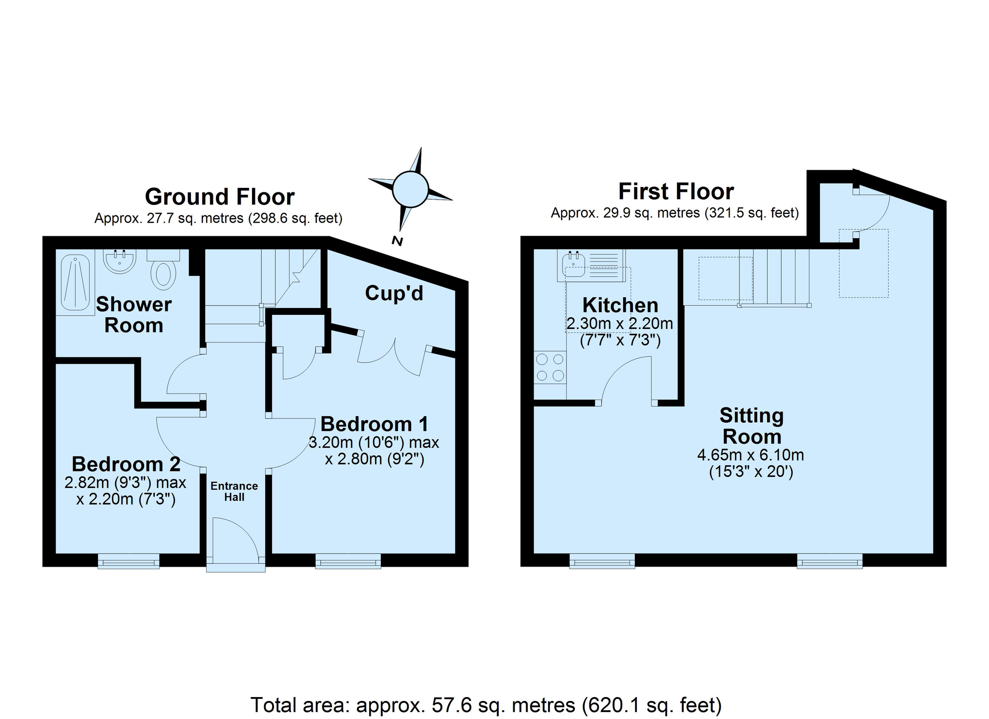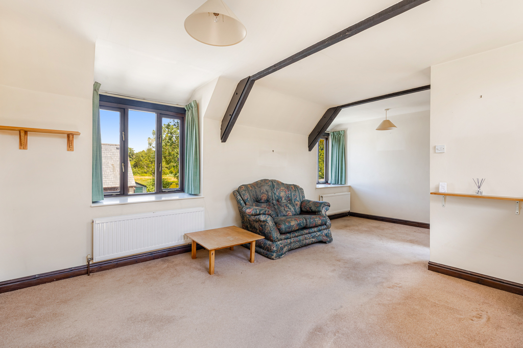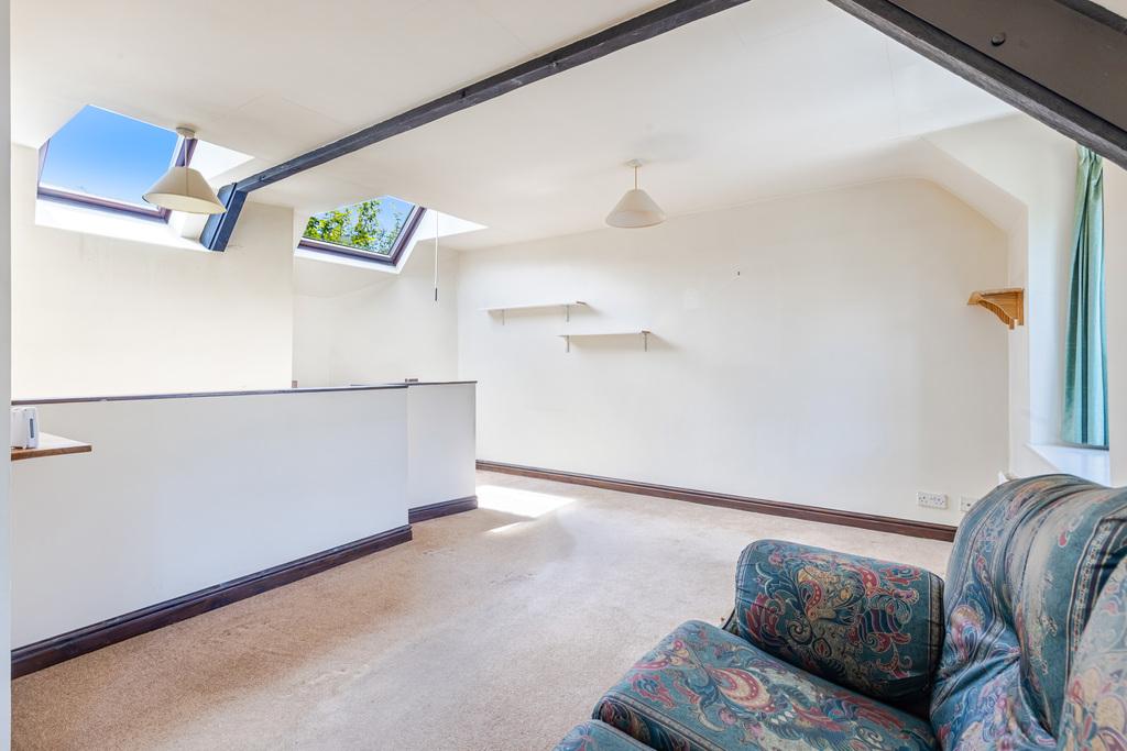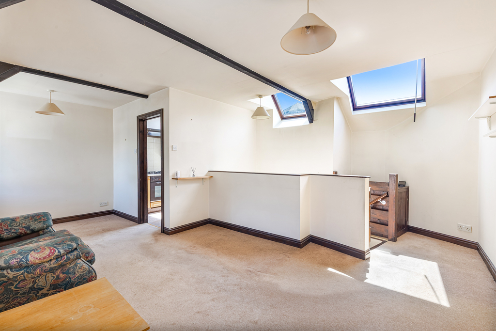 Offering reverse level living, a door to the front of the property open to the entrance hall, giving access to two double bedrooms and a shower room. Bedroom one benefits from a walk-in cupboard and under stairs storage. To the first floor is a spacious sitting/dining room with velux windows filling the room with natural light. The kitchen has a range of wall and base units with built-in oven and space for other appliances .