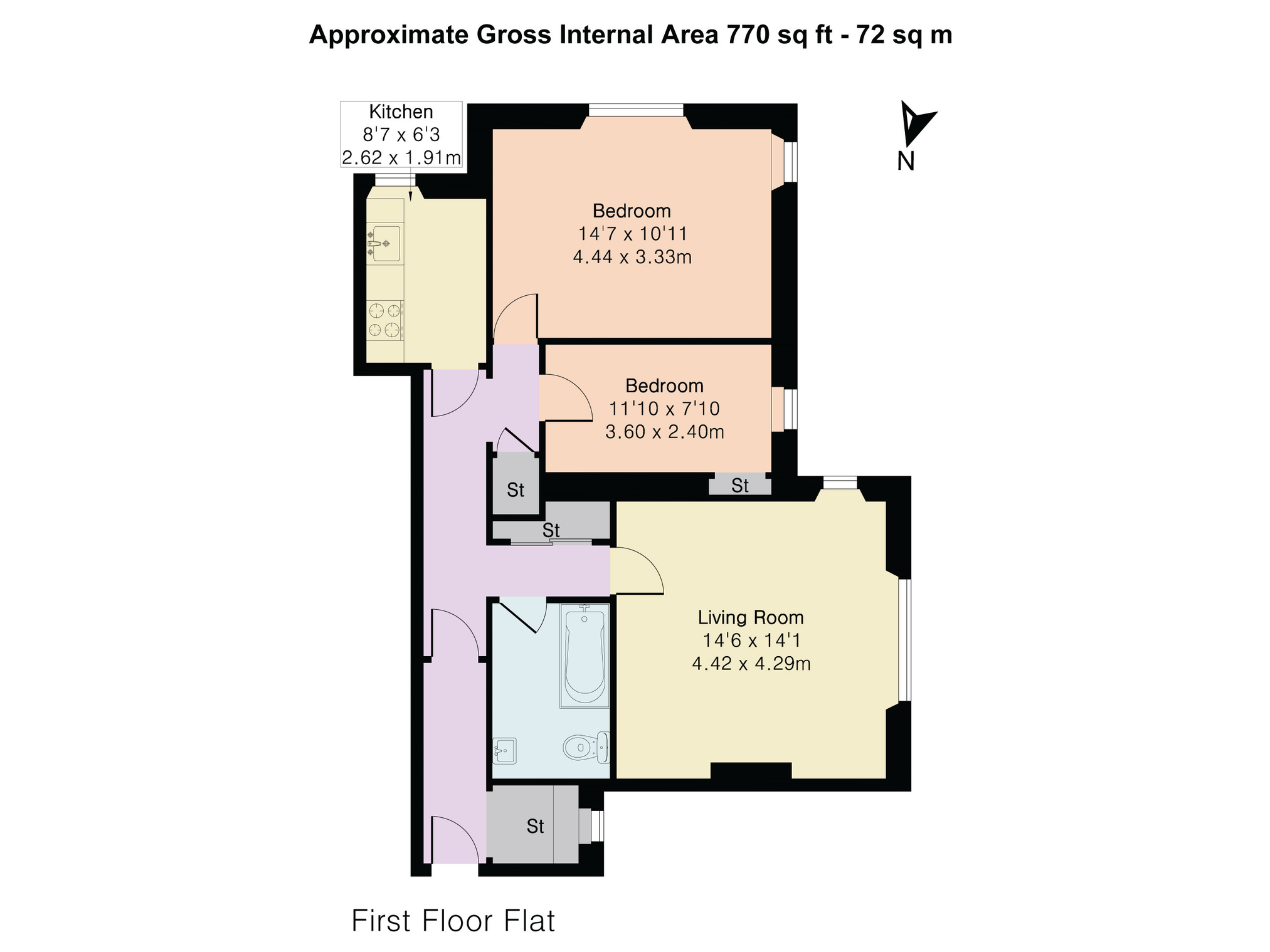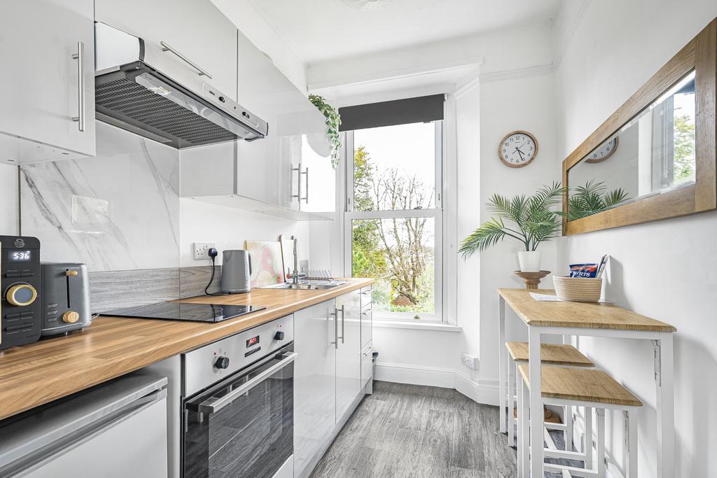 The apartment is entered on the first floor with the entrance hall fitted with storage cupboards. The galley Kitchen is fitted with a range of wall and base units with great natural light with space for a breakfast bar. The living room has lovely views over Totnes with a double aspect and great volume with a period fireplace. There is a beautifully proportioned principle bedroom again with a double aspect and a smaller double bedroom. The main bathroom is a modern suite and fully tiled with a shower over the bath.