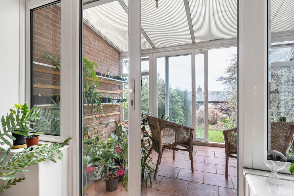 The front garden is mostly laid to lawn with mature shrubs and trees offering privacy, a path leads to the side entrance and around to the rear garden which has a section of lawn leading to a gravelled area with greenhouse and space to grow vegetables, beyond here is the driveway parking.