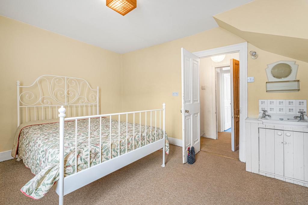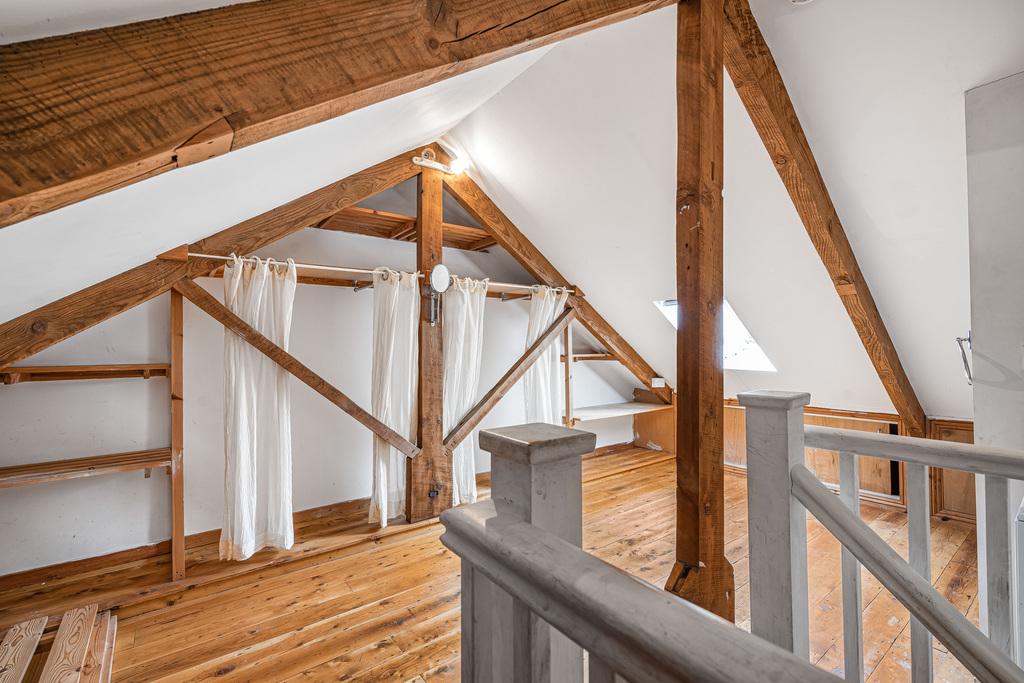 On the ground floor is the living room with lovely ceiling heights, pine floors and a fireplace. The country kitchen is fitted with a range of wood units and has ample space for a dining table and provides access to the rear scullery and rear door to the courtyard. Upstairs on the first floor are two bedrooms and a shower room and on the top floor is an attic room / bedroom three with a WC and wash hand basin.