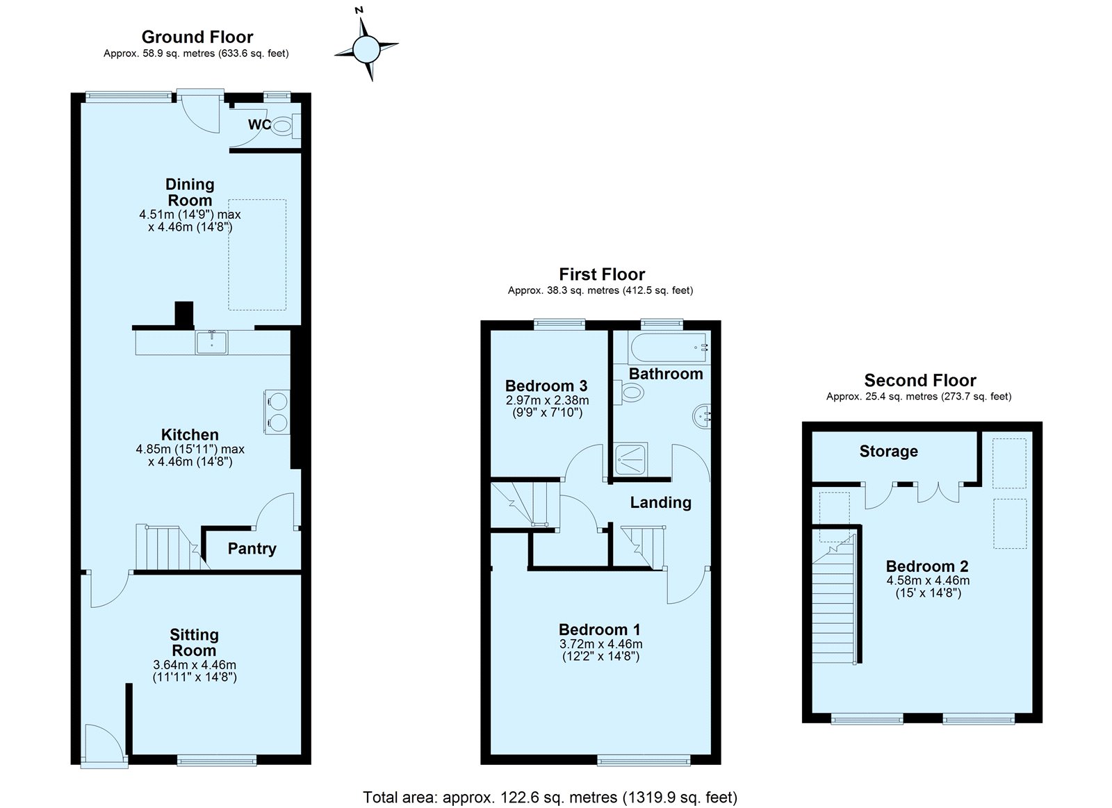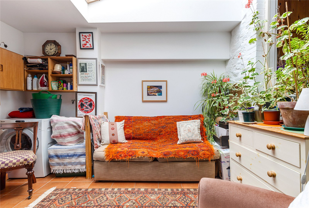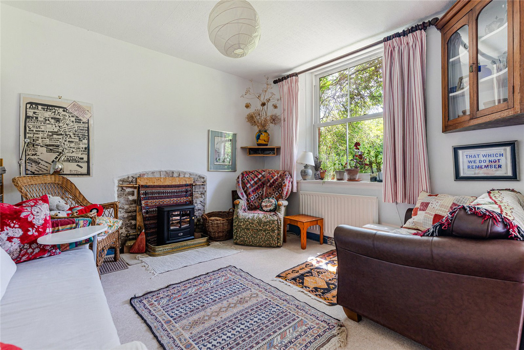 A garden path leads to the front door that opens into a light, airy, south-facing sitting room. Its door leads into the kitchen and stairs to the first floor. The kitchen has a roomy larder cupboard, an electric AGA and Belfast sink. It in turn opens into a dining room at the rear of the property (currently used as a secondary sitting/activity room) with skylights that enhance natural lighting. The back door leads from here to the footpath access on the other side and rear garden.