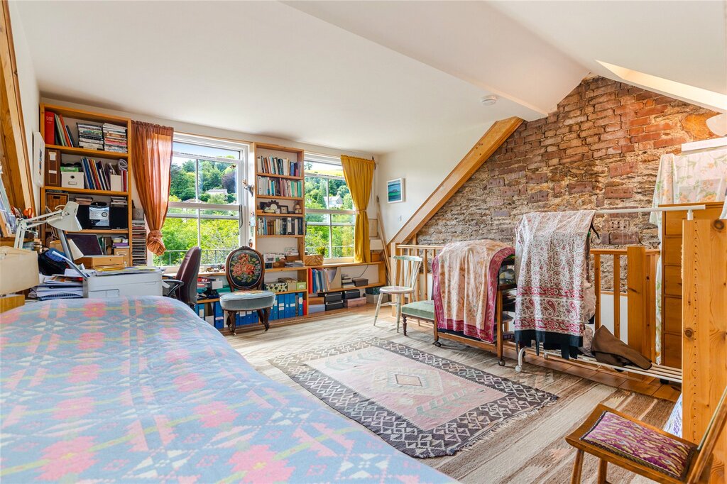 On the first floor is the family bathroom, a large double bedroom and a single bedroom. Stairs to the second floor open into a substantial third bedroom/studio. Here on one side windows facing south give a high view over trees and hills, while, on the other side, veluxes overlook rooftops of the town.