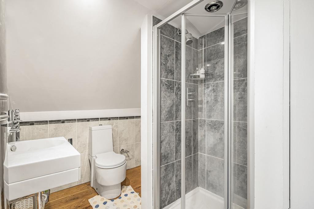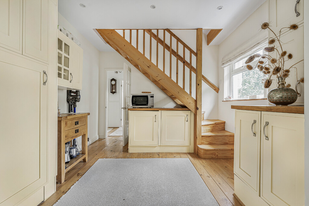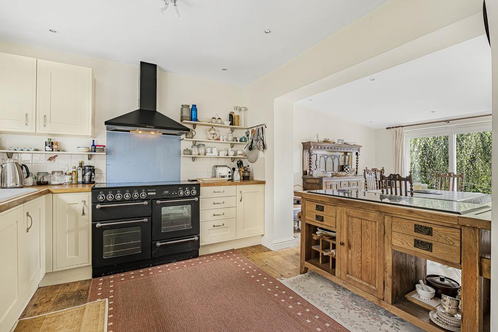 Entered via the entrance hall the living room is located to the front with a log burner and a bay window with lovely views over the front gardens. There are two bedrooms on the ground floor one with patio doors out onto the garden and a family bathroom. The kitchen dining room is a great size with a fitted kitchen and a range cooker with ample space for a dining room table with patio doors out onto the garden. Upstairs the loft has been converted to create a lovely light main bedroom with Velux windows and an en suite shower room.