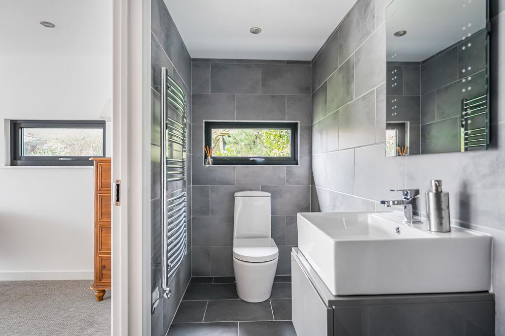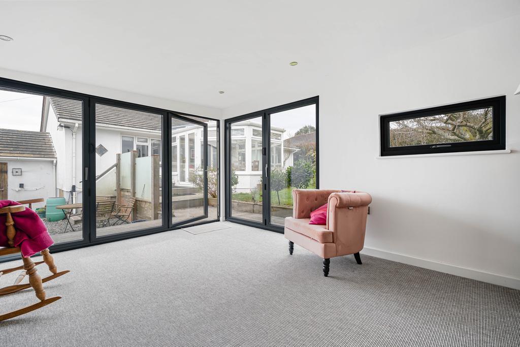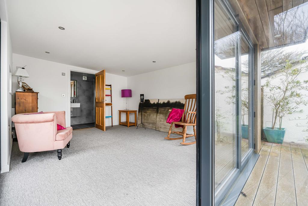 Outside is a superb garden room with bi fold doors and an en suite bathroom making an excellent home office or overflow accommodation. At the front of the house there is hard standing for several cars and a garage providing additional storage. The garden is laid to lawn with shrub and flower boarders.