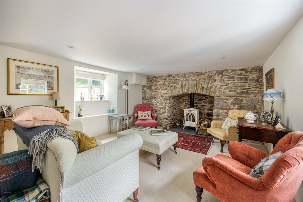 You enter the property through a generous sized porch - a perfect spot to take off boots and shoes after a country walk. The porch leads into the characterful sitting room, with stone fireplace and log burner. This room extends through into a dining room with French doors leading out to the west facing garden. This room could also be used as a home office if preferred. Steps lead from the snug down to the inner hall with side entrance door and stairs leading up to the first floor. There is a contemporary shower room and wide access into the wonderfully light open plan kitchen/dining/family room. Sliding doors lead out to the west facing terrace and garden, the perfect spot to enjoy the afternoon and evening sun. The kitchen has a walk-in larder cupboard and 4 oven electric Aga. The family room is lovely and light with a fireplace and log burner. A well-equipped utility and boot room leading out to the garden, space for washing machine and tumble dryer, cupboard space and boiler.