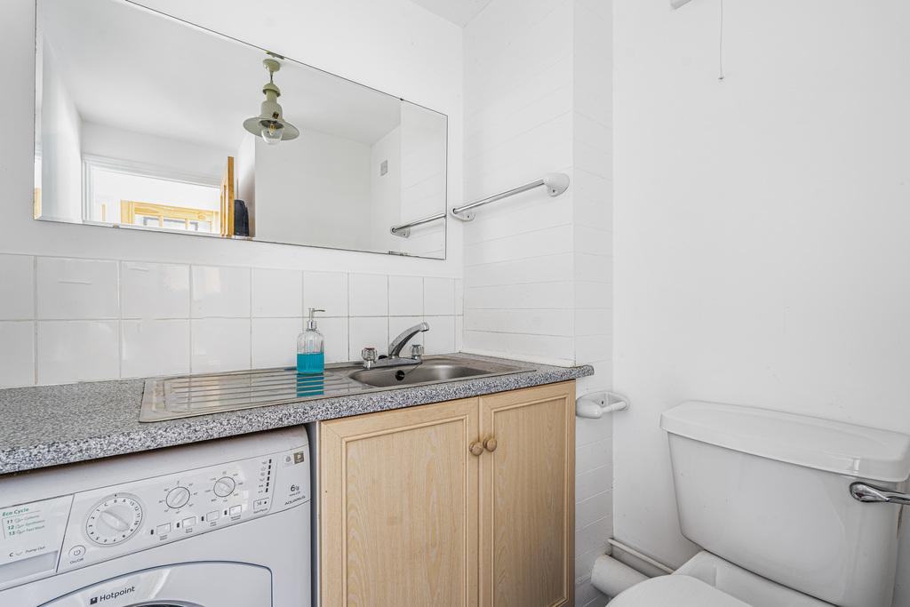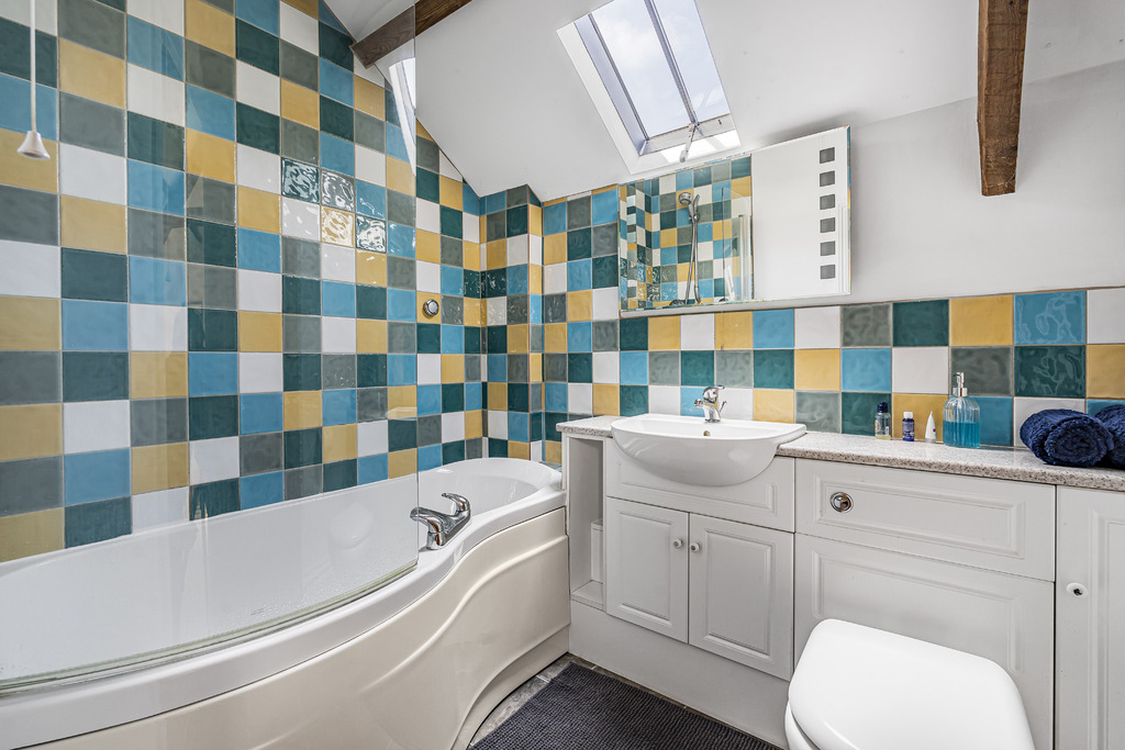 Parking space to the front leads to the entrance porch giving access to the hallway which has storage cupboard and cloakroom. To one side of the hallway is the kitchen with space for a table and chairs and to the other side is the sitting room, fitted with a wood-burning stove and door giving access to the front courtyard. Upstairs are two double bedrooms, a single bedroom and the family bathroom.