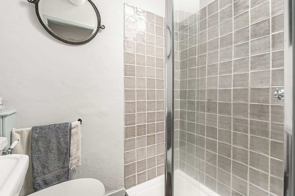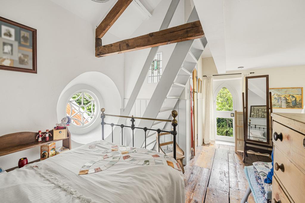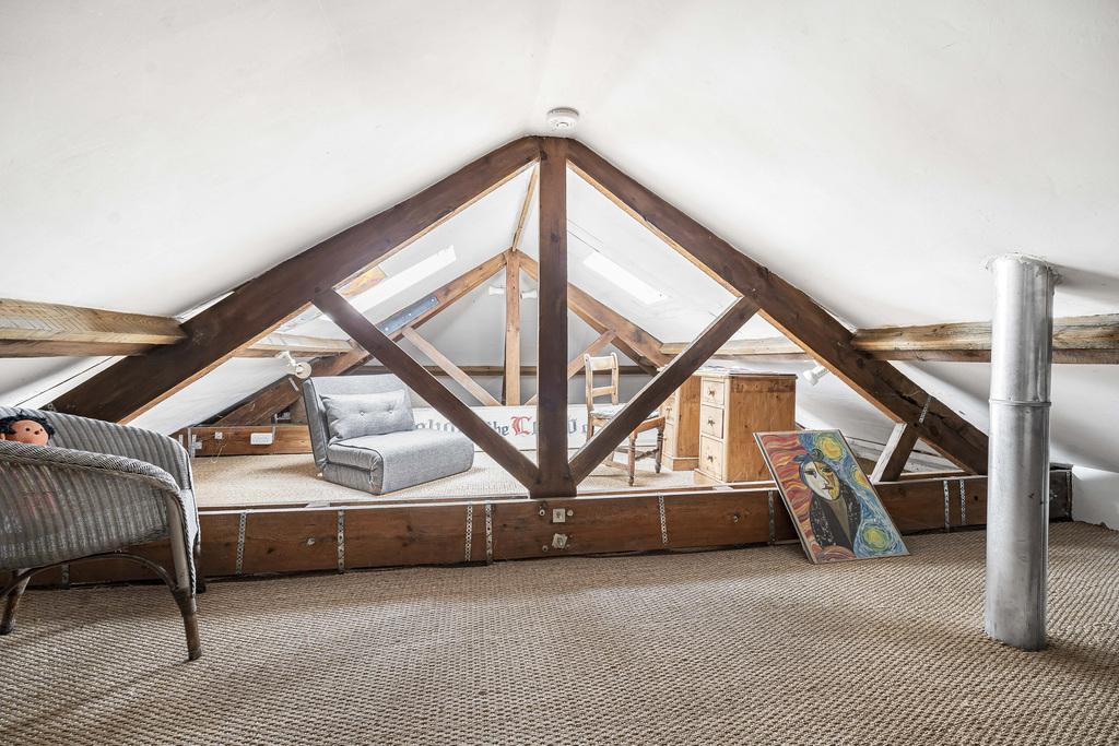 From the living area an open plan staircase rises to the mezzanine with circular feature window and external door opening to the stone steps that lead to the rear garden. A door from the mezzanine opens into the recently fitted shower room. A further open plan staircase rises from the mezzanine to a spacious loft area with two velux windows.