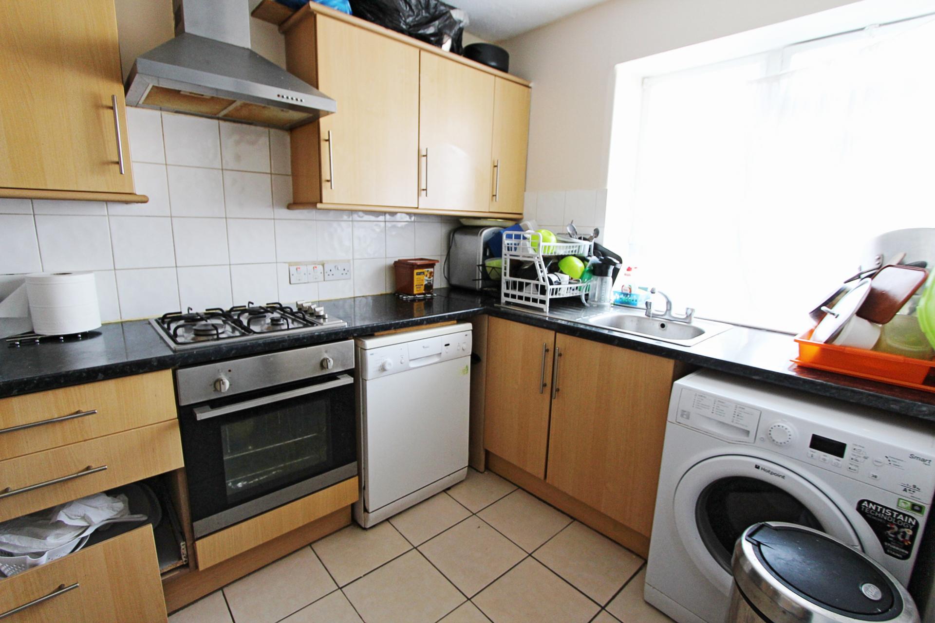 Range of base and wall units with roll top work surfaces, stainless steel sink, space for fridge freezer, plumbing for washing machine, window to front aspect Tiled flooring.