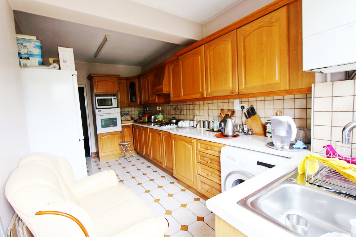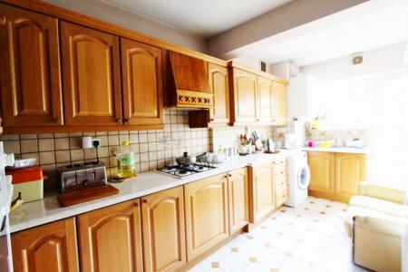 Range of base and wall units with roll top work surfaces, stainless steel sink, space for fridge freezer, plumbing for washing machine, double glazed window to rear and access to garden. Tiled flooring.