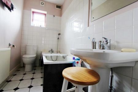 Panel enclosed bath , pedestal hand wash basin, low level flush WC, Tiled flooring.