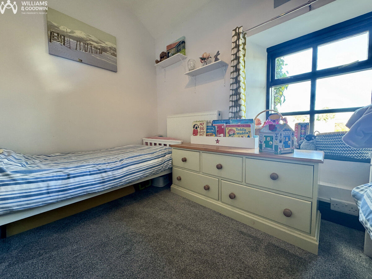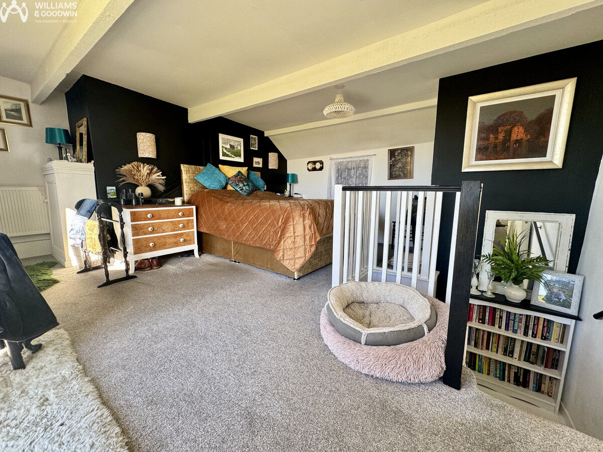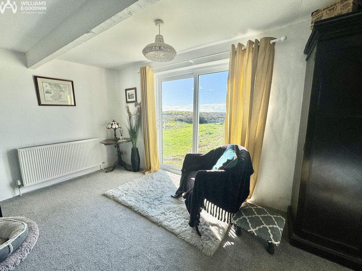 An inner hallway leads to two generous ground-floor bedrooms, both served by a modern shower room with a contemporary white suite and a wide walk-in shower. Upstairs, the spacious main bedroom enjoys sliding patio doors that open directly onto the raised rear garden, the perfect vantage point to take in panoramic views across the surrounding countryside.