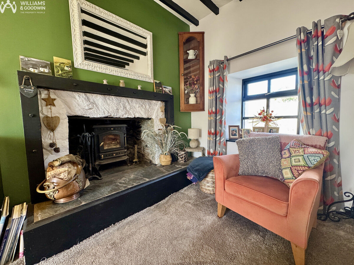 Step inside through a small entrance hall and you’ll find a bright and spacious lounge to one side, full of rustic character. This inviting room showcases exposed ceiling beams and a striking stone fireplace housing a cast iron log burner, a wonderful focal point for cosy evenings. From here, a contemporary uPVC sunroom opens onto the rear patio, creating a lovely indoor-outdoor connection ideal for relaxing or entertaining.