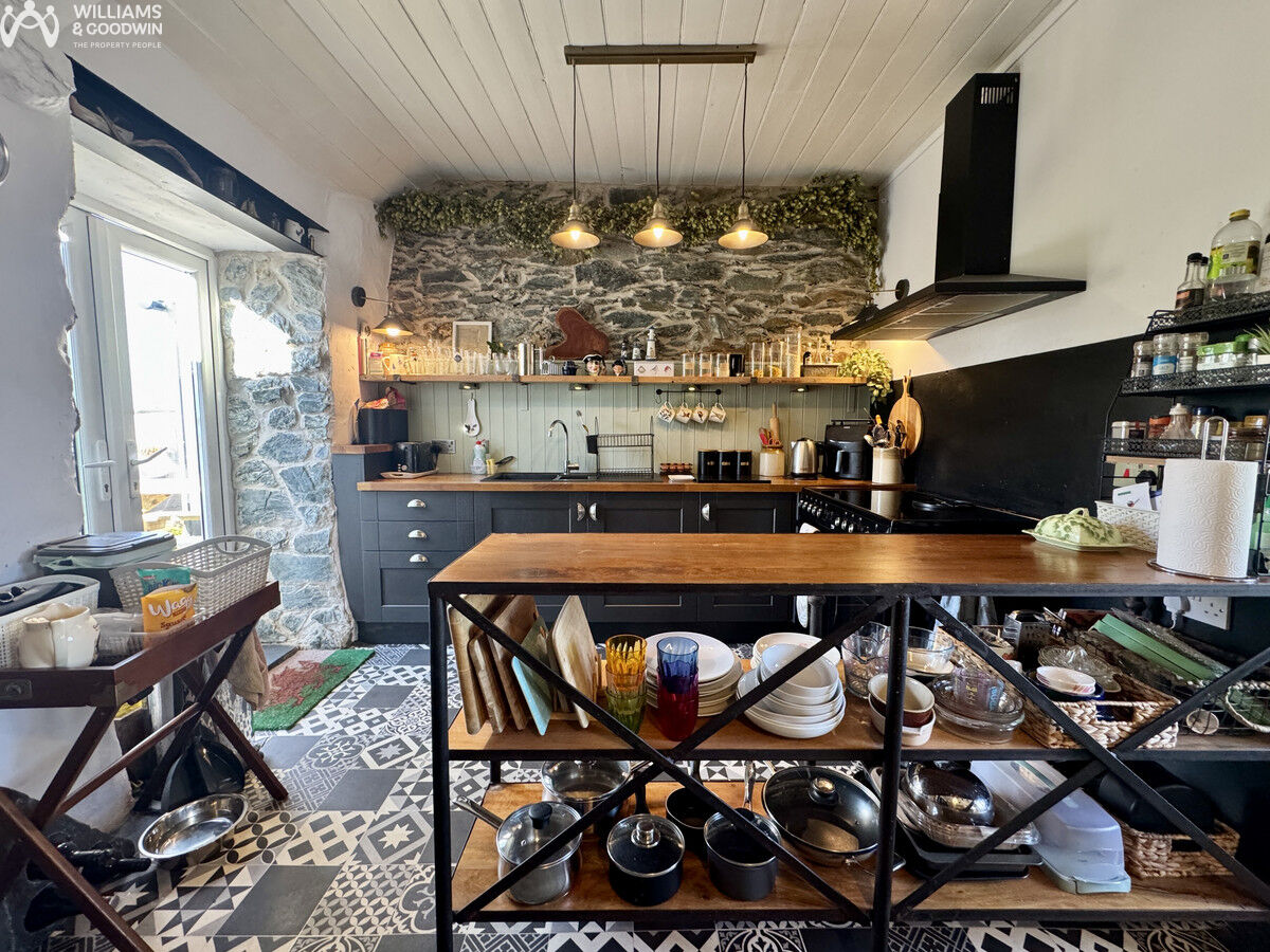 Across the hall lies a stylish kitchen and dining area, featuring open shelving and an exposed stone wall complete with an original open fireplace, blending traditional charm with practical design. A large utility room with WC is conveniently located to the side of the property.