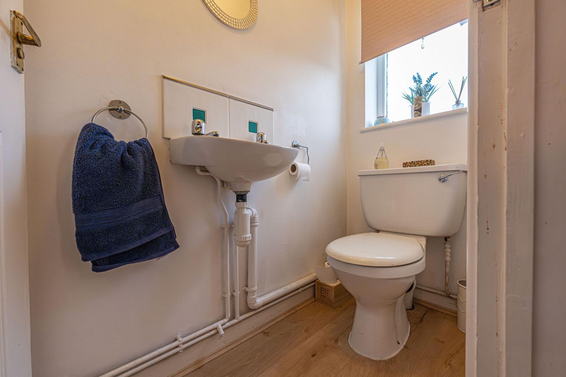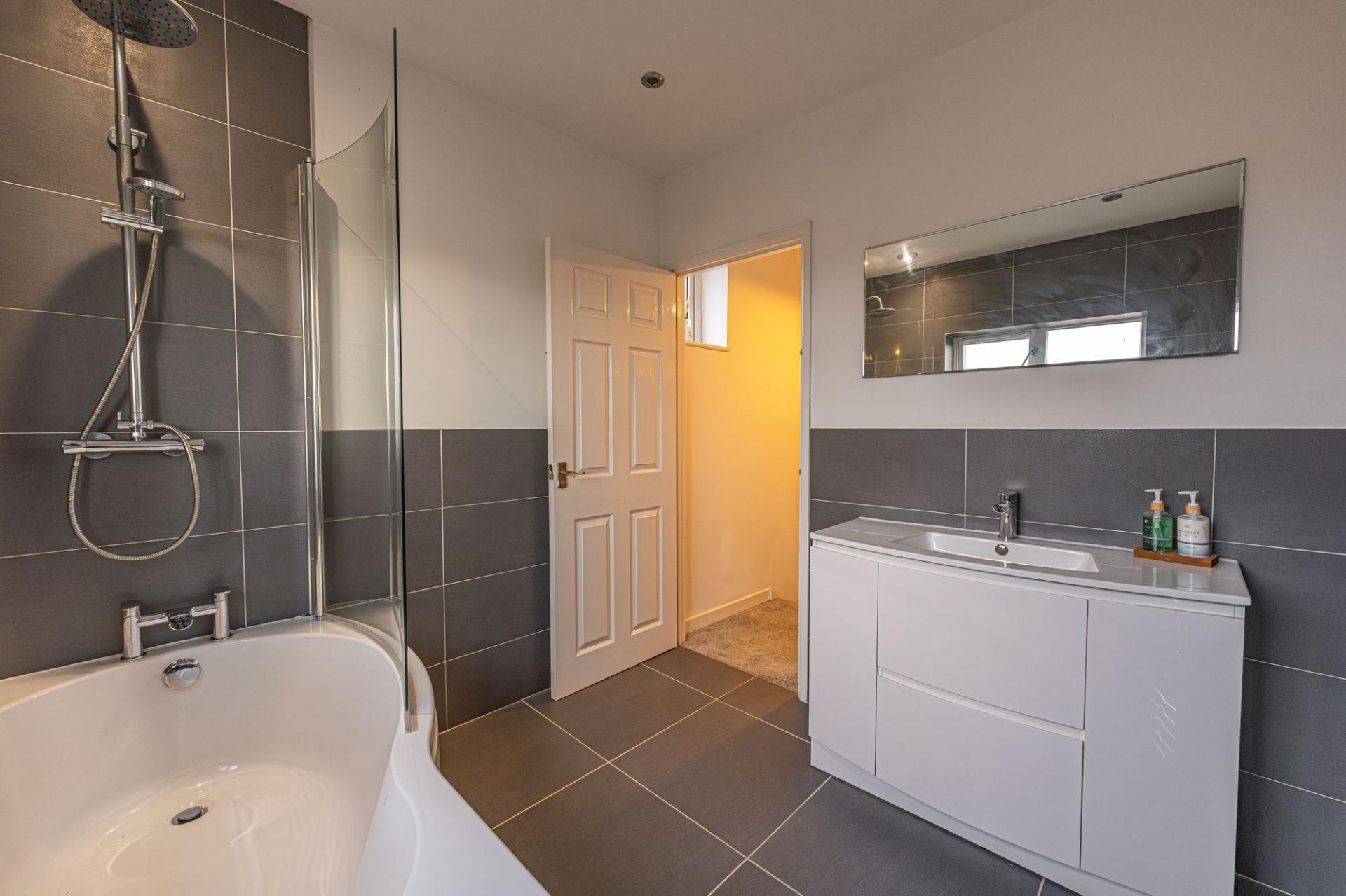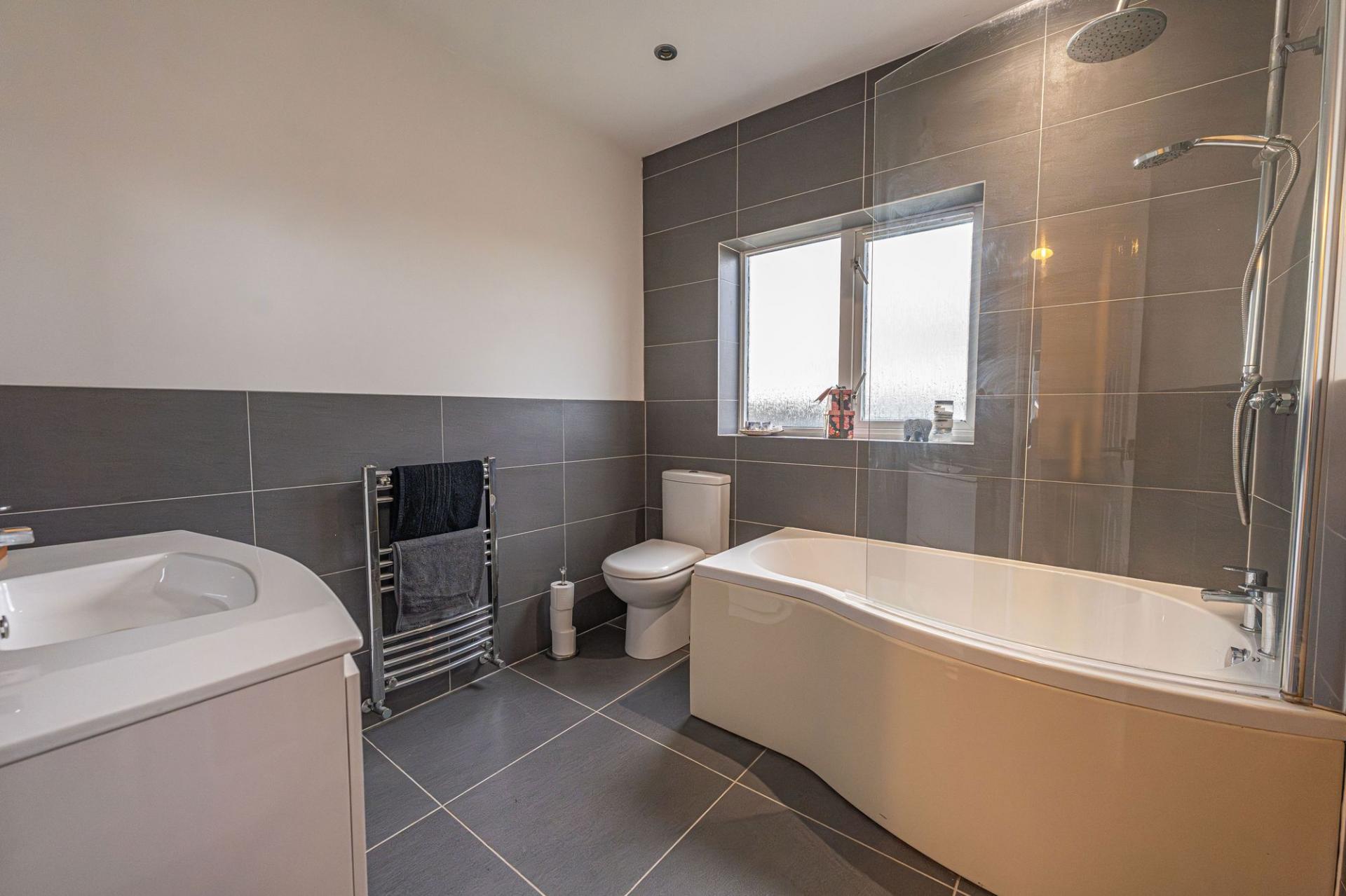 The remaining three bedrooms are located upstairs, with two doubles and a third single - the latter offering a ideal space for a home office. The primary bedroom has the added benefit of numerous fitted wardrobes for added convenience, while from the hallway an airing cupboard is communally available - as is the stylish modern bathroom, appointed with a curved bath tub, and overhead shower.