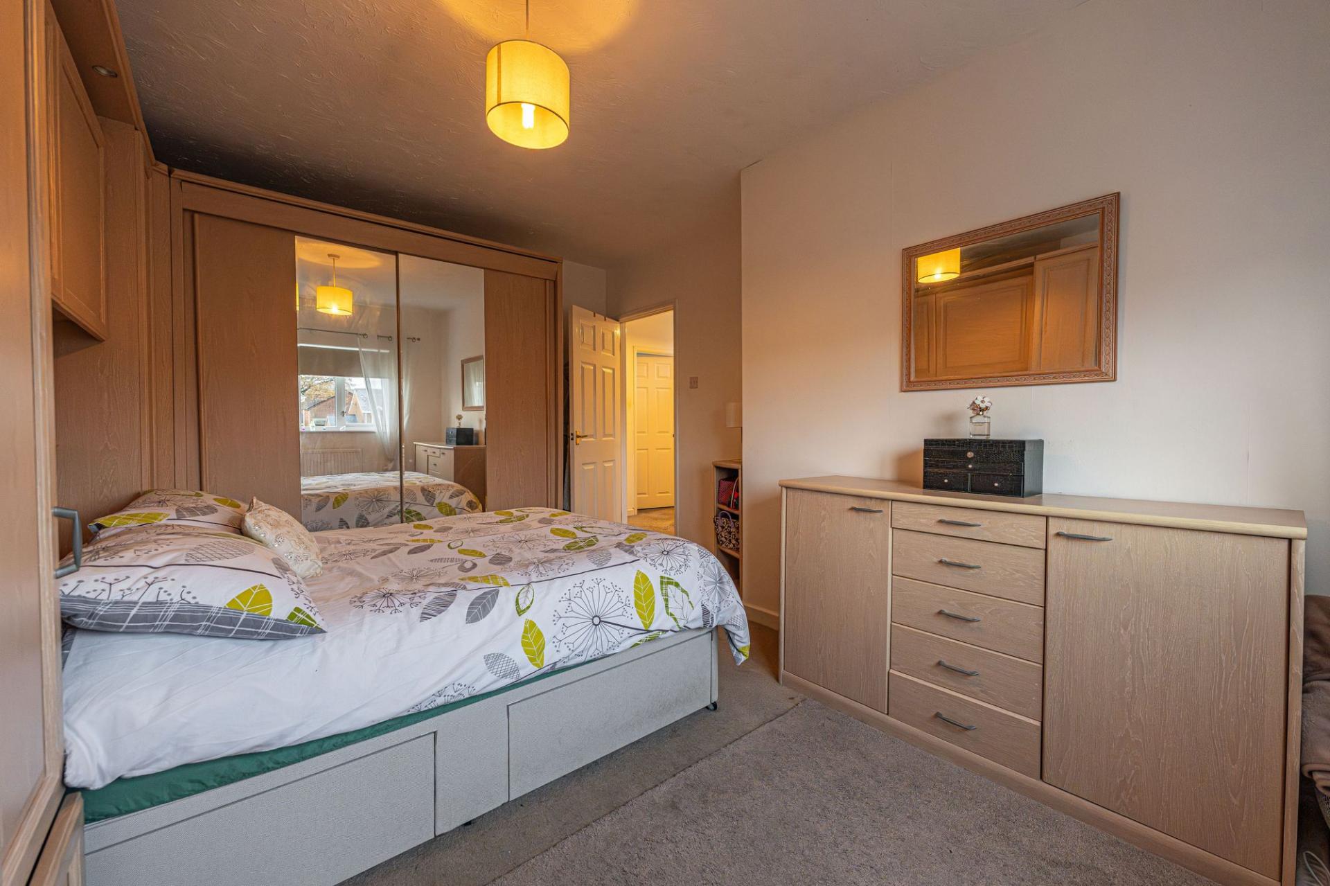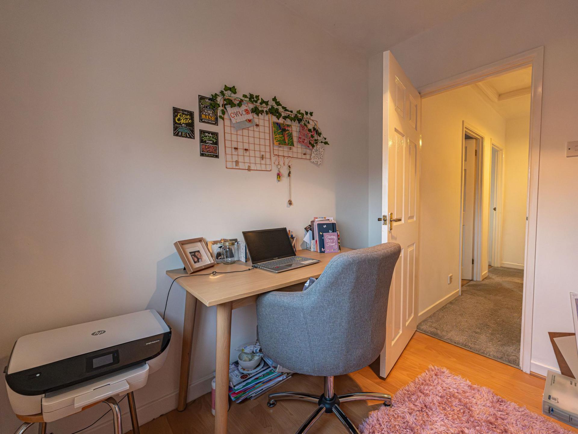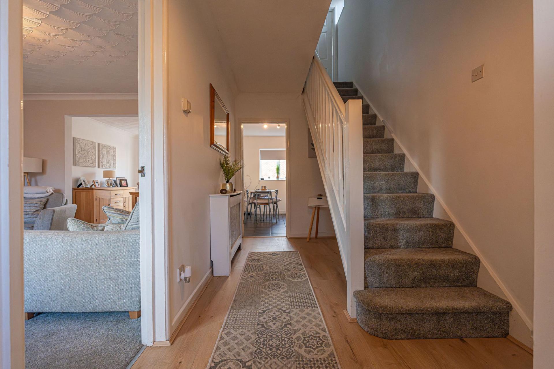 The remaining three bedrooms are located upstairs, with two doubles and a third single - the latter offering a ideal space for a home office. The primary bedroom has the added benefit of numerous fitted wardrobes for added convenience, while from the hallway an airing cupboard is communally available - as is the stylish modern bathroom, appointed with a curved bath tub, and overhead shower.