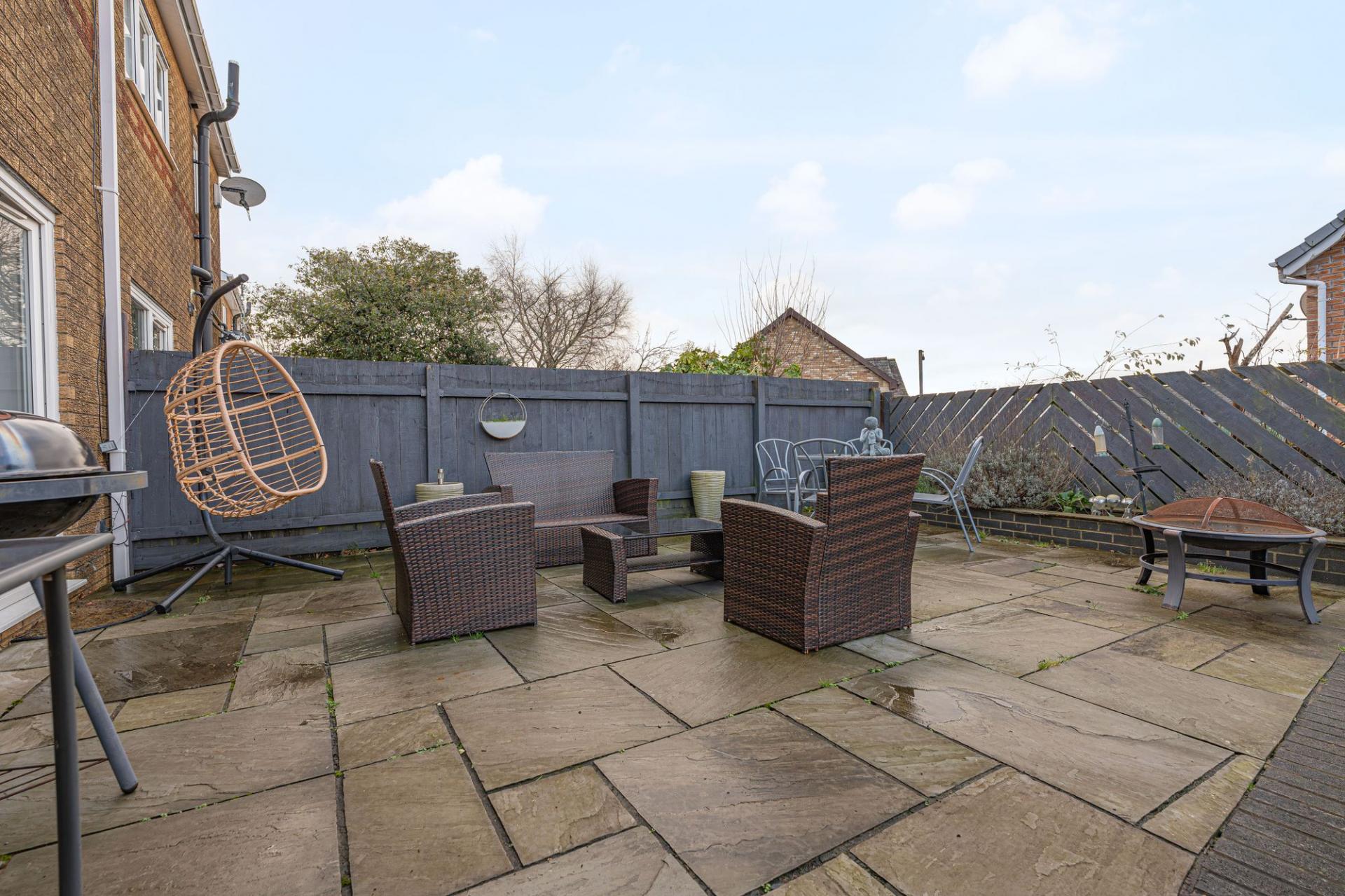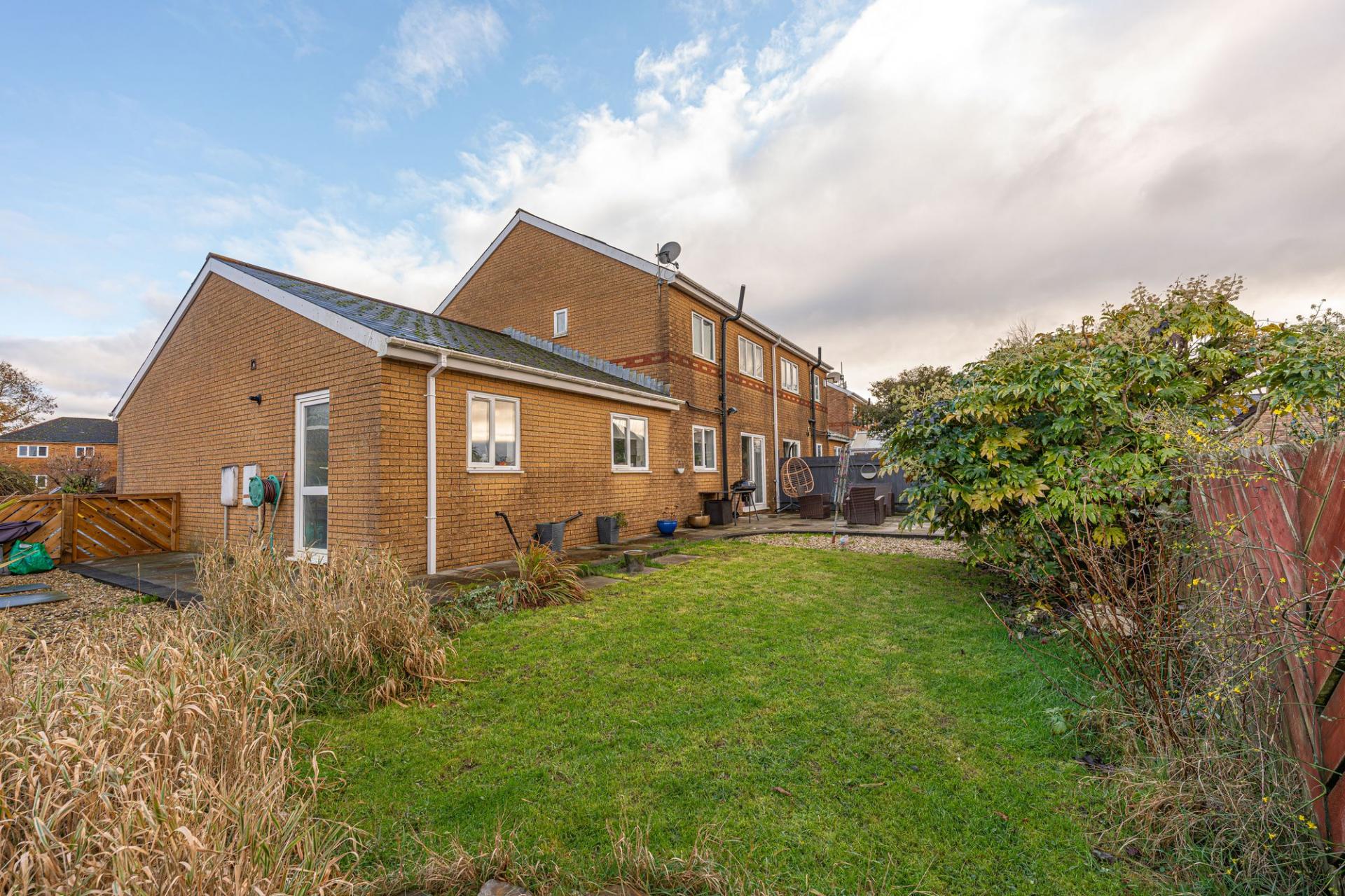 Outside, the rear garden is a true highlight, benefitted by a generous corner position, with a spacious landscaped lawn and patio which is ideal for lounging in the fresh air, and entertaining guests over tea/coffee or dining al-fresco style. At the front of the house there is another lawn space adjacent to the driveway, which can park at least two vehicles, as well as accessing the garage.